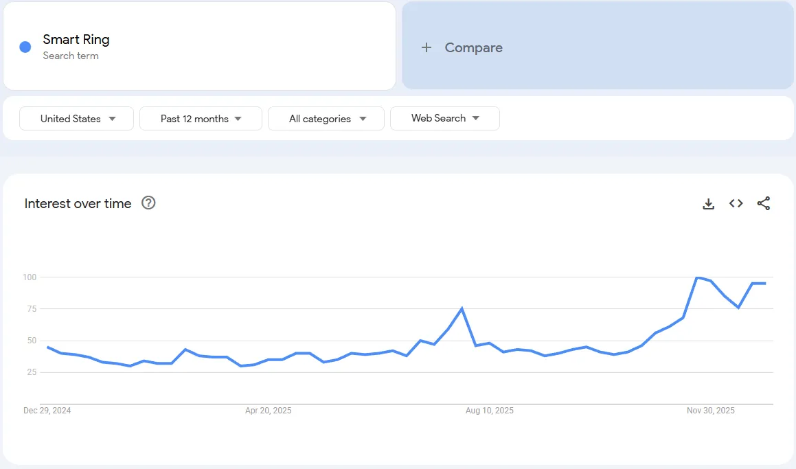 Посмотрите на график выше. Это количество запросов по запросу "Samsung Ring" за последние 90 дней. Вы видите этот огромный всплеск в ноябре? Это Samsung тратит миллионы долларов на образование. твой будущие клиенты. Понимание: Теперь общественность знает, что такое Smart Ring. Но большинство потребителей не готовы платить 399 долларов. Тенденция поиска стабилизируется, а это означает, что «фаза ажиотажа» закончилась и начинается «фаза покупки» доступных вариантов (50–80 долларов США).