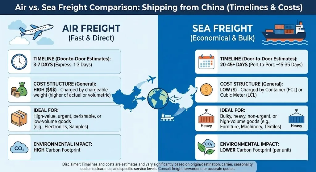 (Вверху: инфографика сравнения воздушных и морских грузовых перевозок из Китая с указанием сроков и стоимости)